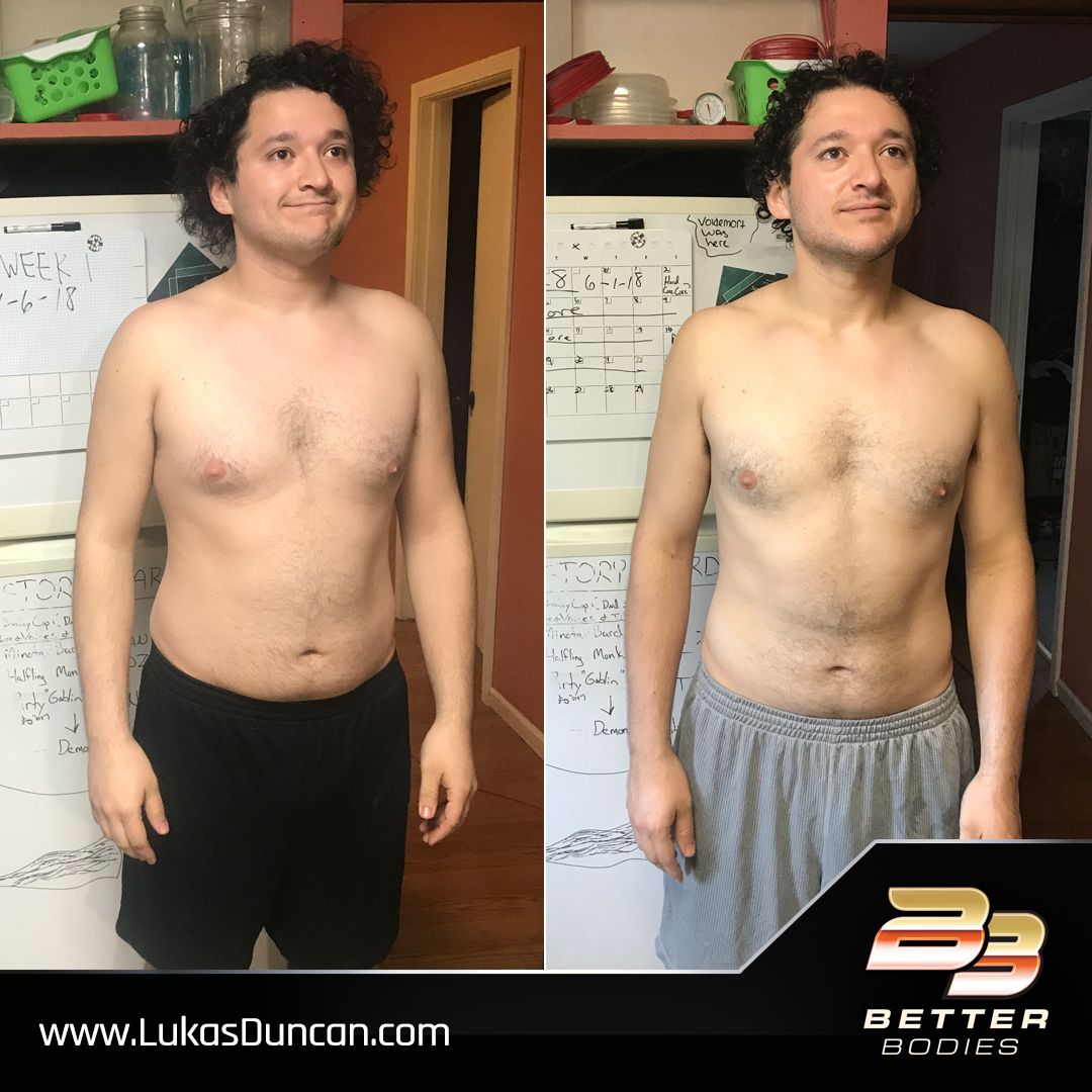 "I lost around 30 lbs of fat and went from a 38" waist to 32". I'm down to 175 lbs from 205lbs. It's nice to recognize my face again. Thanks so much, I'm keeping up with the meal plan and exercises to keep it up. I'll probably be back in 3 weeks asking for a program to start bulking up haha. Thanks for all of the assistance!!!"